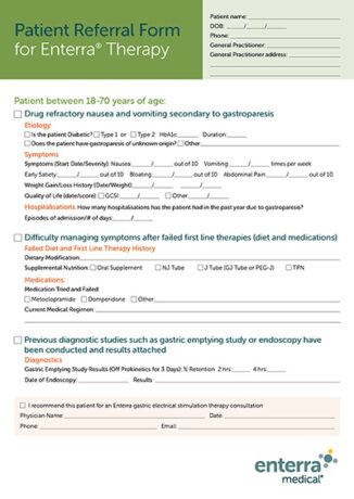 Verwenden Sie dieses Formular, um Ihre Patienten auf Gastroparese zu screenen und sie für eine Beratung zur Therapie mit einer elektrischen Magenstimulation zu überweisen.